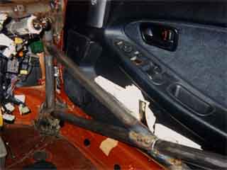 内装をハグってみると、こんなカンジです。 Aピラー(フロントウィンドウ枠)の根元から、 その真下のフロアにパイプを溶接して、 そこにX字の先を溶接しています。 |